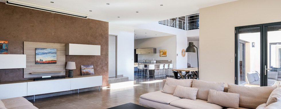 Dès l’entrée, le volume impressionne : Une pièce de vie au plafond cathédrale baignée de lumière de plus de 90m2, qui réunit cuisine équipée, salle à manger et salon, avec un accès direct aux terrasses.